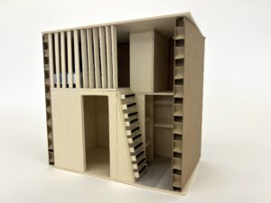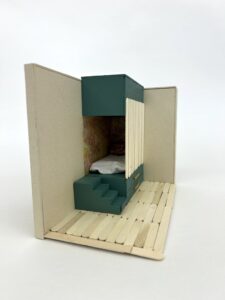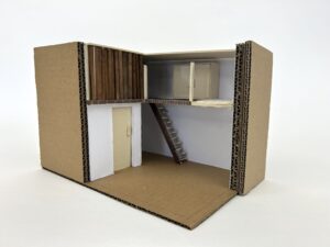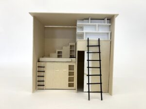 Les étudiants en 2ème année du Bachelor Design d’Espace et Micro-Architecture ont livré un projet portant sur l’aménagement d’un studio de 17m2comportant l’ensemble des éléments nécessaires pour les usages quotidiens. Dans cette perspective, l’organisation des espaces est orientée vers l’optimisation des volumes voire la multiplication d’usages de certains éléments. La hauteur sous plafond de 3.5m doit être impérativement exploitée car elle permet la mise en place d’une mezzanine, d’espaces de stockage, d’un lit ou autres solutions afin d’optimiser la surface restreinte de studio. La conception du studio est axée sur le développement durable faisant appel au réemploi, au recyclage ou encore à l’upcycling. Une fois le travail d’agencement établi sur plans, coupes et élévations, les étudiants doivent matérialiser l’agencement du studio par une maquette. Celle-ci ne reprend pas l’ensemble mais seulement un détail de leur choix.