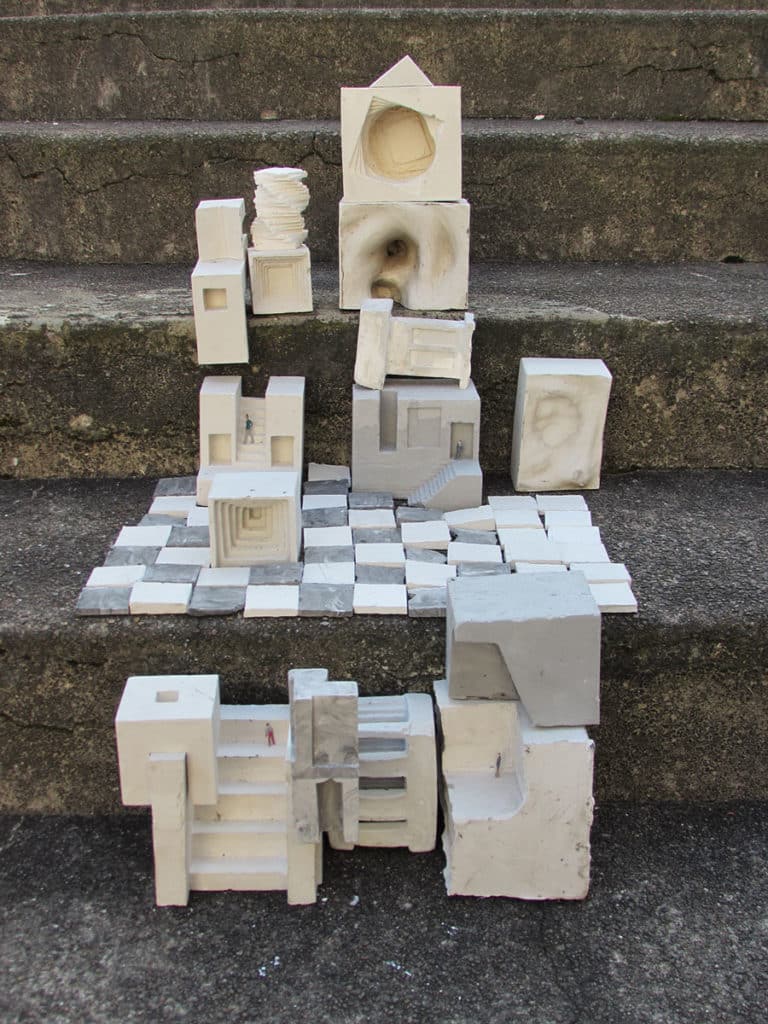 Une fois l’ensemble de volumes abouti, un travail photographique de composition a été réalisé en exploitant le potentiel des volumes dans différentes compositions ainsi que dans différents endroits. Une composition d’ensemble a été également proposée dans laquelle toutes les formes sont mobilisées comme dans une grande ville à échelle réduite.